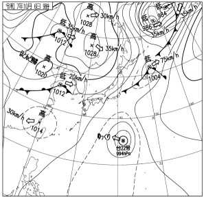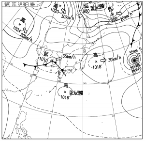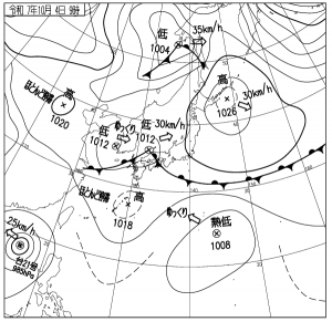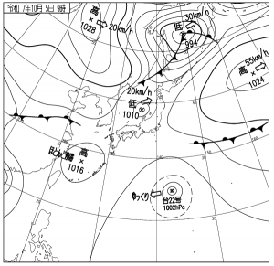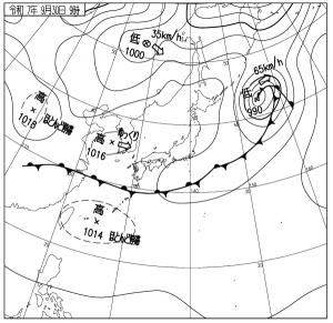 低気圧が山陰沖に進み、そこからのびる前線に向かって暖湿流が流入。
