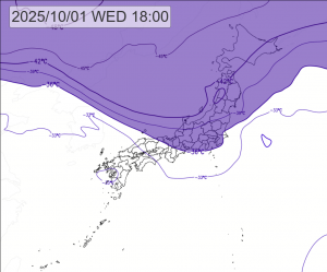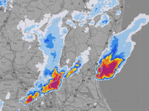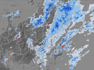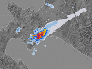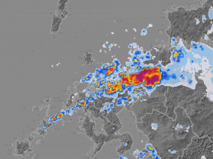 南からの湿った空気が風ぶつかった南側斜面で雨雲が発達し激しい雨。