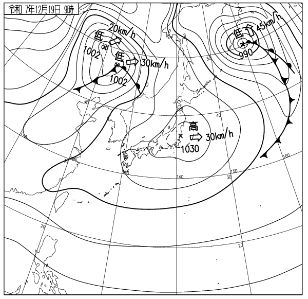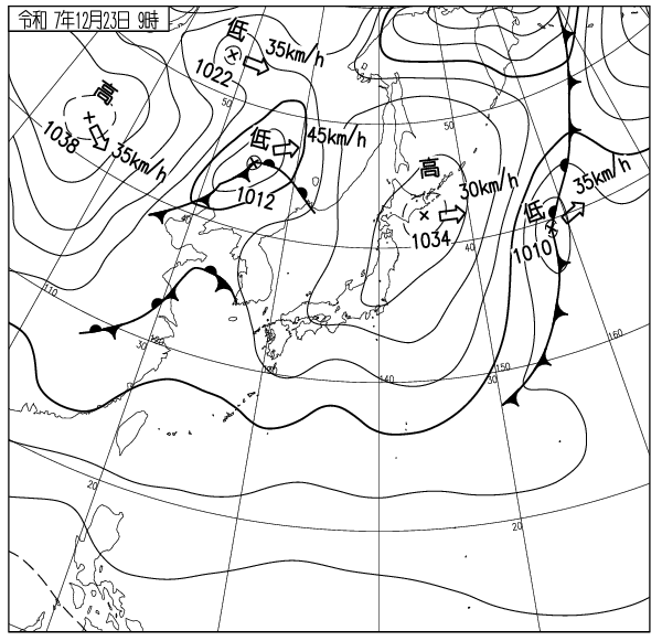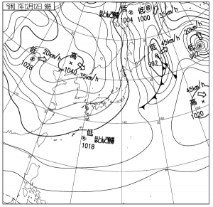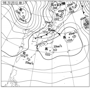 強い冬型の気圧配置となり等圧線が縦じま模様。