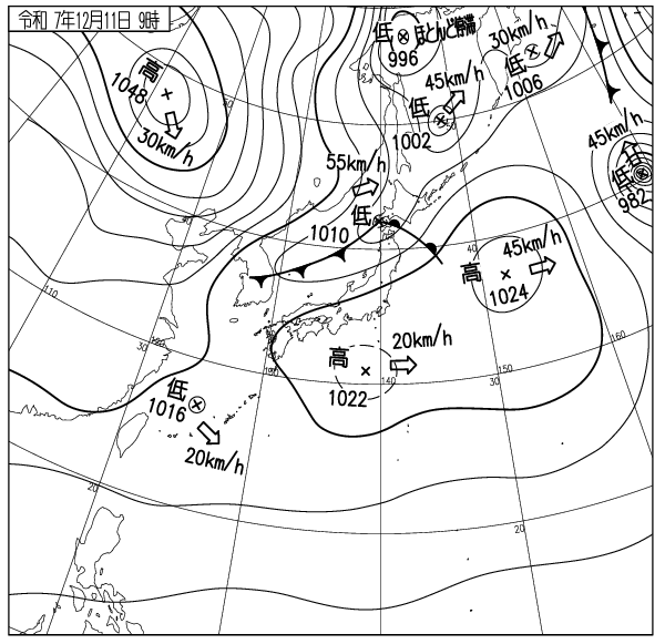 オホーツク海で低気圧が発達して北日本中心に冬型の気圧配置。