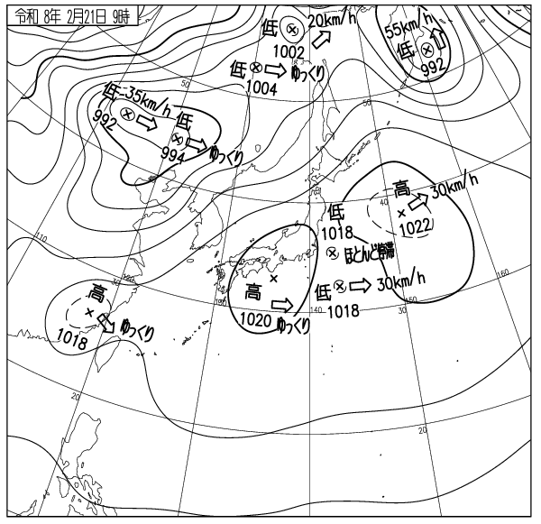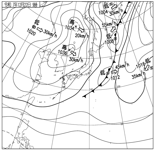 等圧線が縦じまに並んだ冬型の気圧配置、から移動性高気圧の勢力範囲へ。