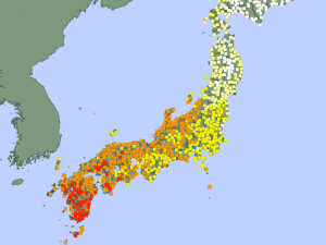 西日本には暖かい空気が流れ込み、陽射しが加わって 鹿児島県肝付町肝付前田では最高気温が35℃、鹿児島市で34℃まで上昇。 10月中旬の猛暑日は初めてで、国内観測史上最も遅い記録。