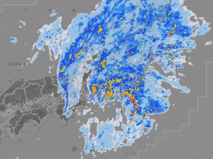 九州の南で発生した低気圧が急速に発達しながら本州の南岸沿いを北東進。 午前中は西日本で雨域が広がり、午後は東海や関東にも拡大。 夜は関東や東海で30mm/hを超える激しい雨のところも。