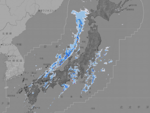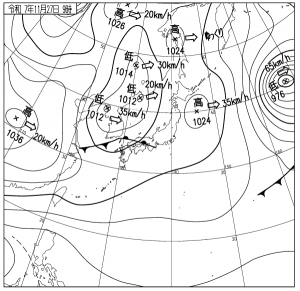 日本海には寒気トラフに伴った低気圧がいくつも並んで南北に延びる気圧の谷。 暖かく湿った空気が流れ込み大気が不安定で、所々で雨雲が発達。 トラフ後面からは寒気移流で、九州や山陰では西風が強まり筋状の雲。