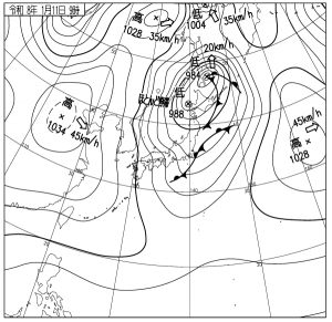強い冬型の気圧配置に移行し、上空5000m付近には-42℃以下の寒気。 日本海側の各地にはびっしりと雪雲がかかり 全国的に北西の季節風が強まり、鳥取市湖山では31.4m/sを記録。