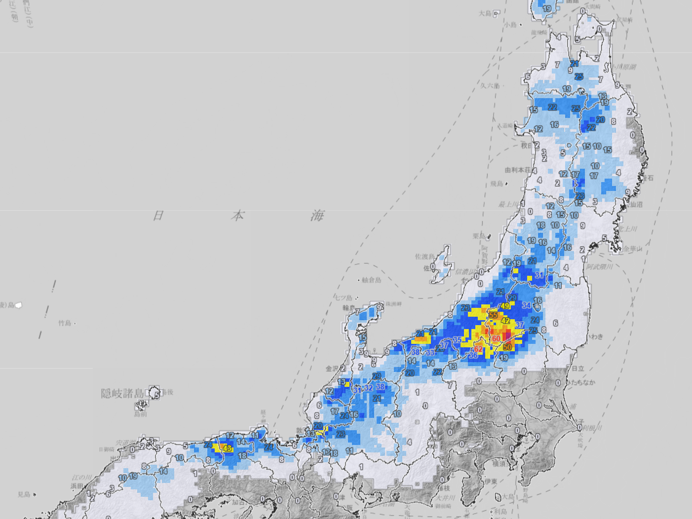 また本州内陸部を中心に大雪となり、24時間降雪量は群馬県みなかみ町藤原で62cm。