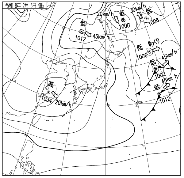 北日本はまだ冬型の気圧配置で季節風がやや強まったものの 日本海側の雪の地点は少なくなり、関東以西は冬晴れ。 西から移動性の高気圧が移動してきて西日本では穏やかな天気。