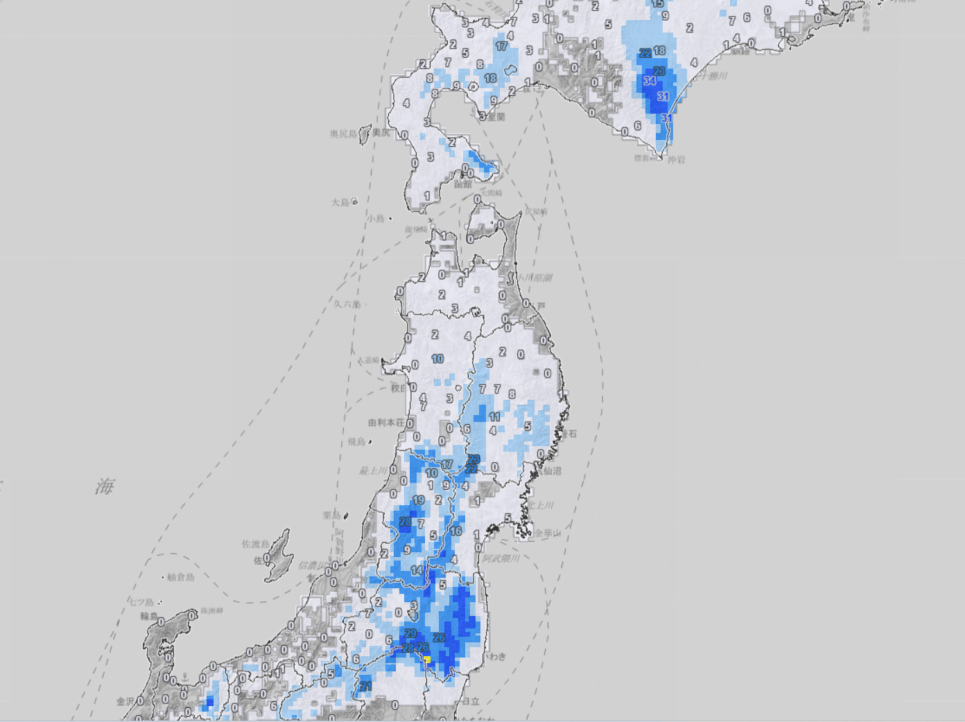 道東を中心に湿った大雪となり、24時間降雪量は広尾町や大樹町で50cm。