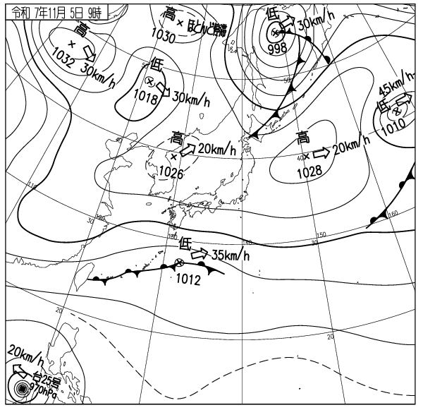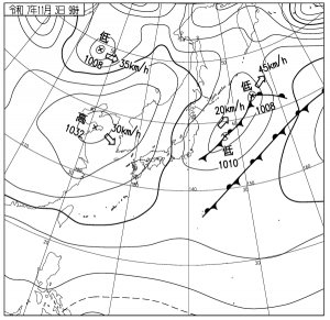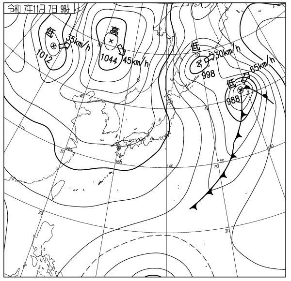 沿海州、日本海、関東東北沖、日本の南、と低気圧が連なり深い気圧の谷が通過。